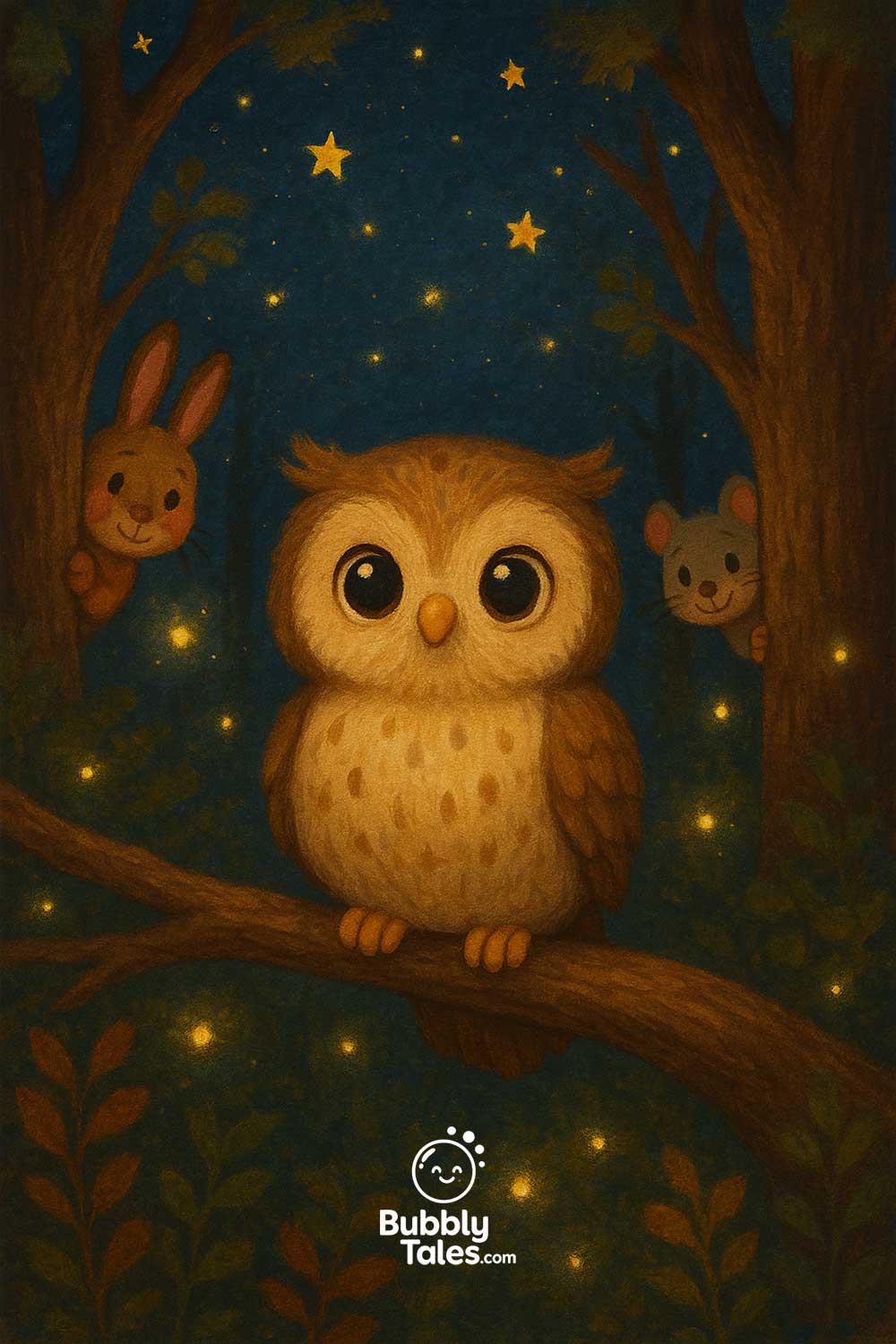En medio del Bosque Susurrante, vivía Olive la Búho, una sabia avecita de grandes ojos redondos. Le encantaba leer las estrellas por la noche y ayudar a quien necesitara consejo.