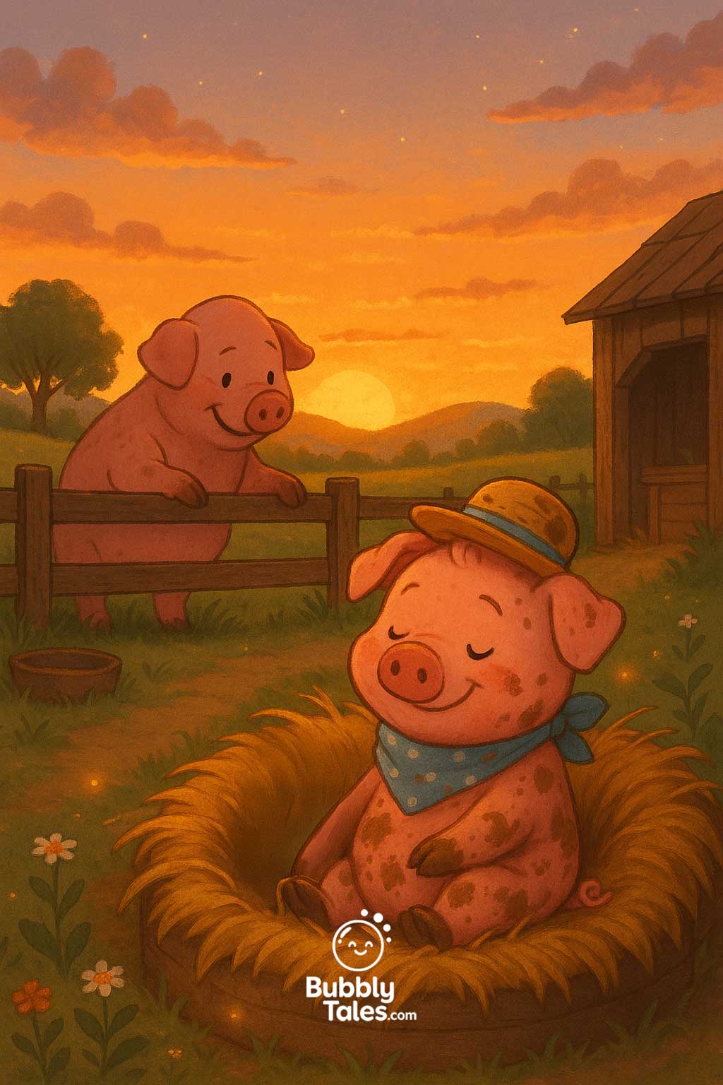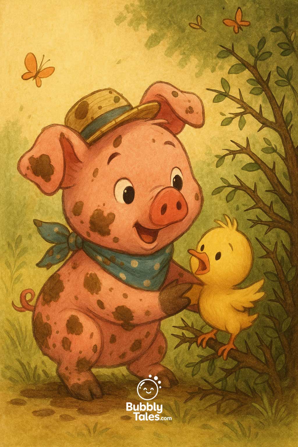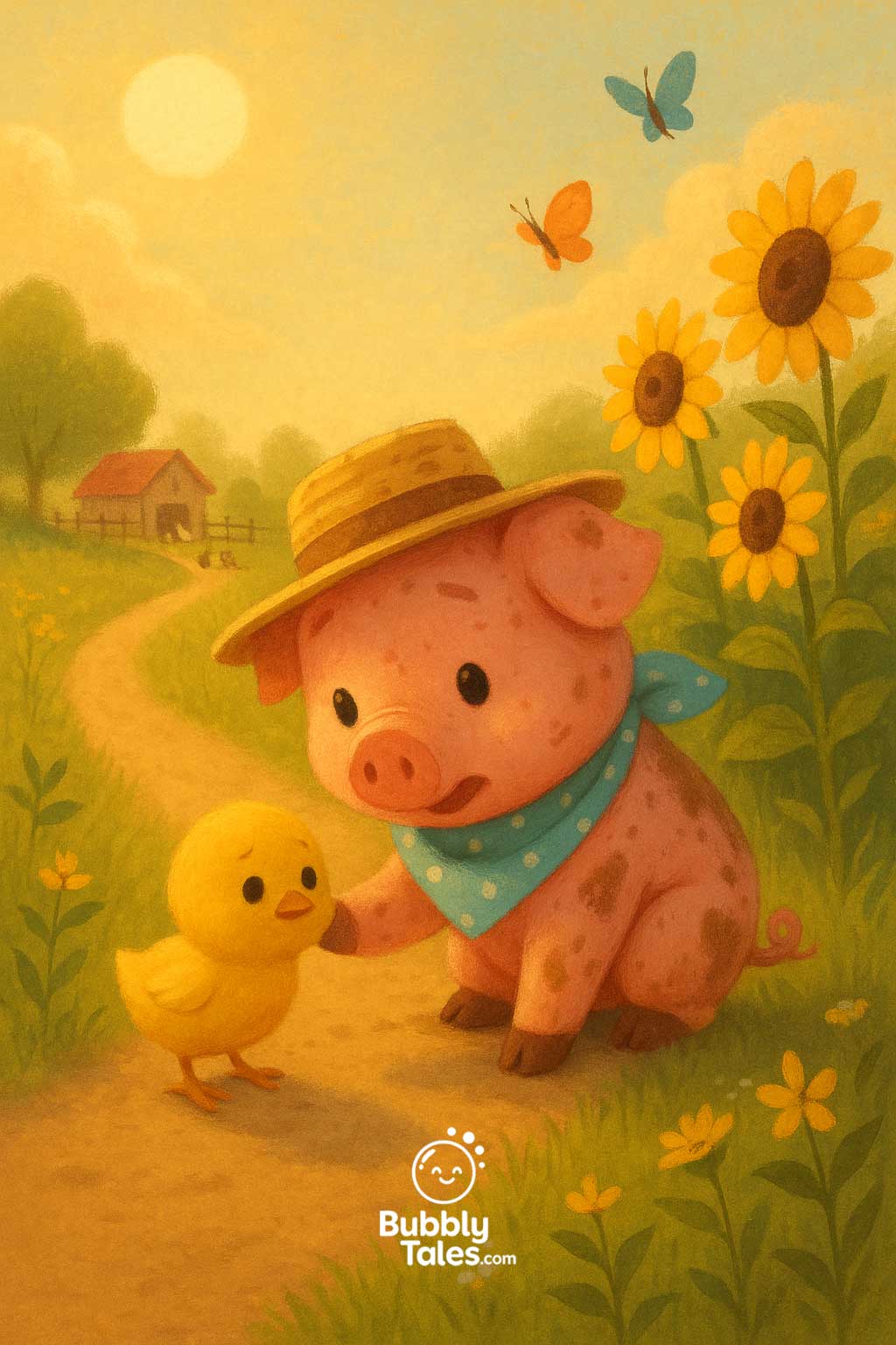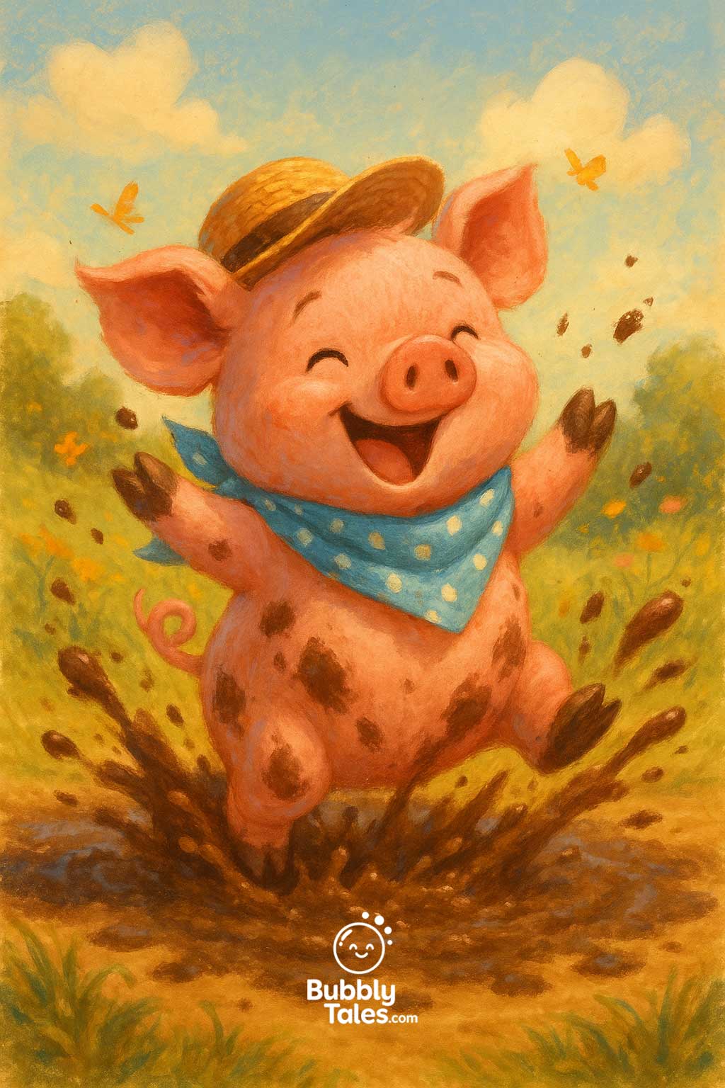 An einem sonnigen Morgen zog Penny, das Ferkel, ihren blauen gepunkteten Schal und ihren Strohhut an.