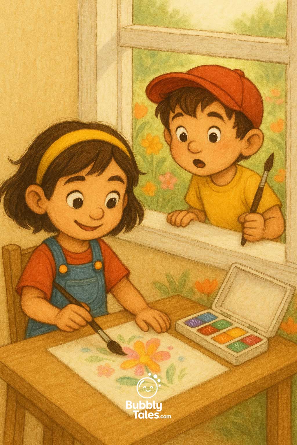 Maya tauchte ihren Pinsel in die Farbe und schnappte nach Luft, als Blumen auf ihrem Papier tanzten. In diesem Moment schaute ein Junge herein.