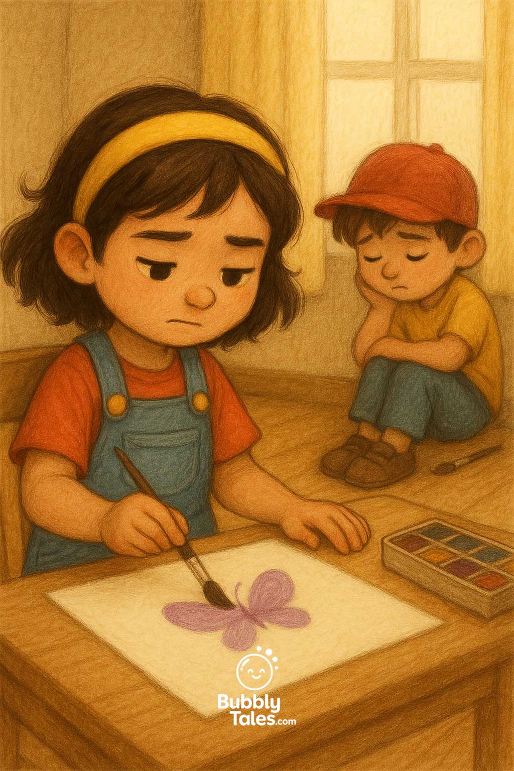 She turned back to her painting. But something felt… off. The colors didn’t sparkle as much. And it wasn’t as fun anymore with Leo sitting quietly, watching.