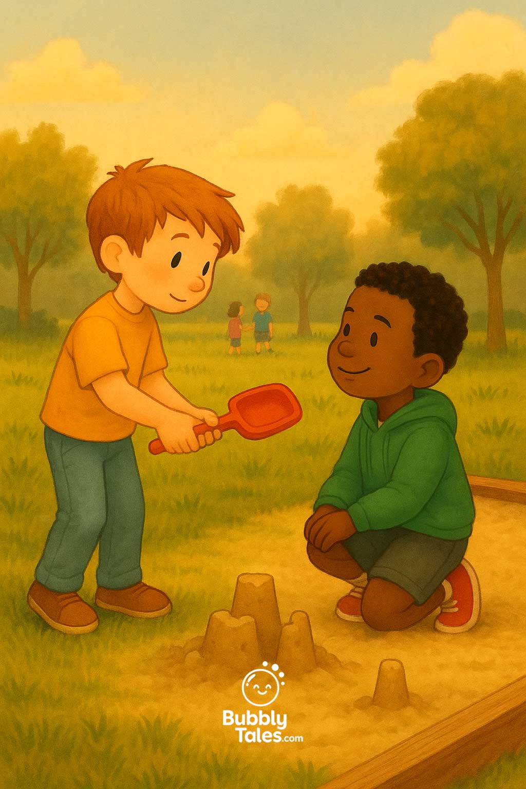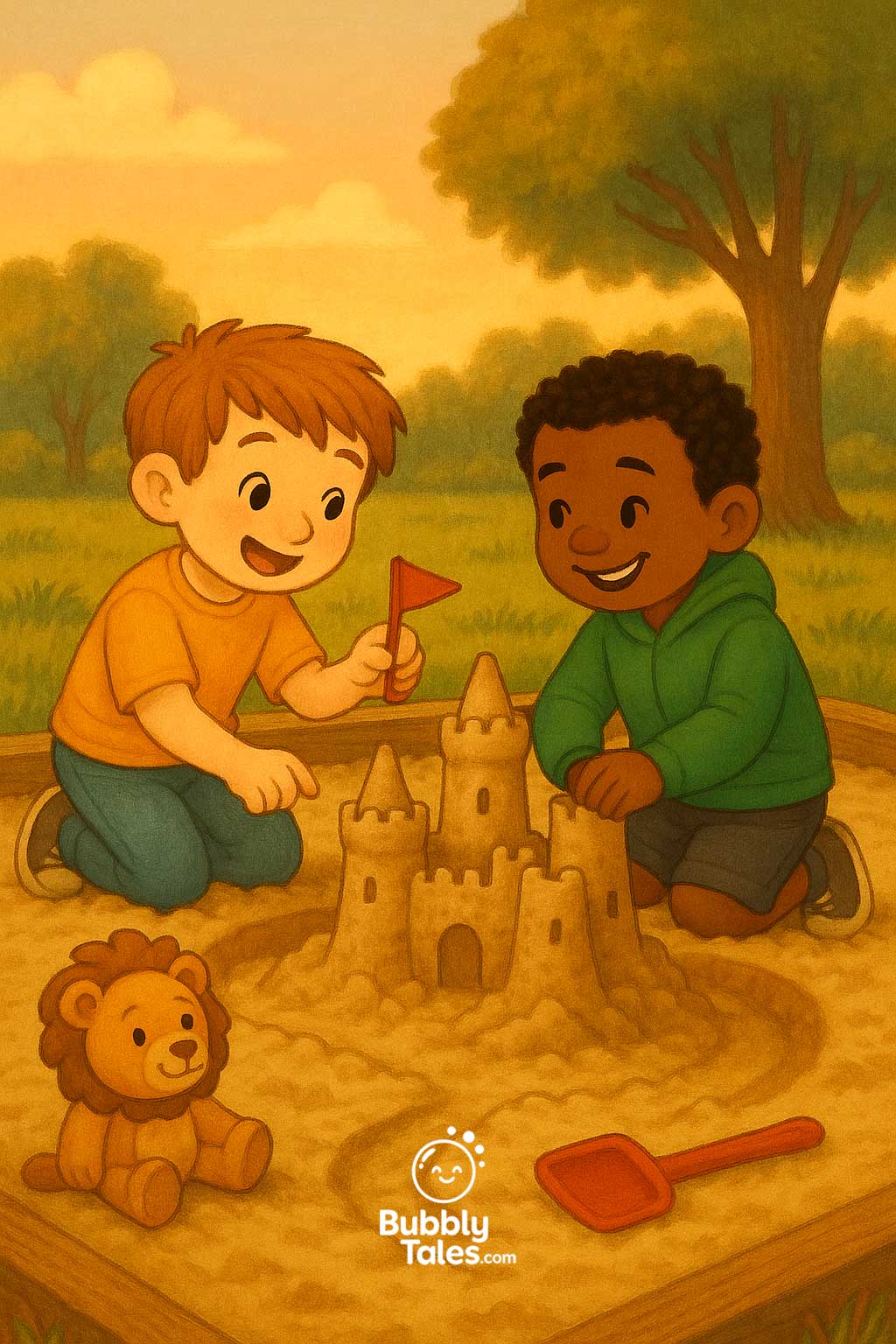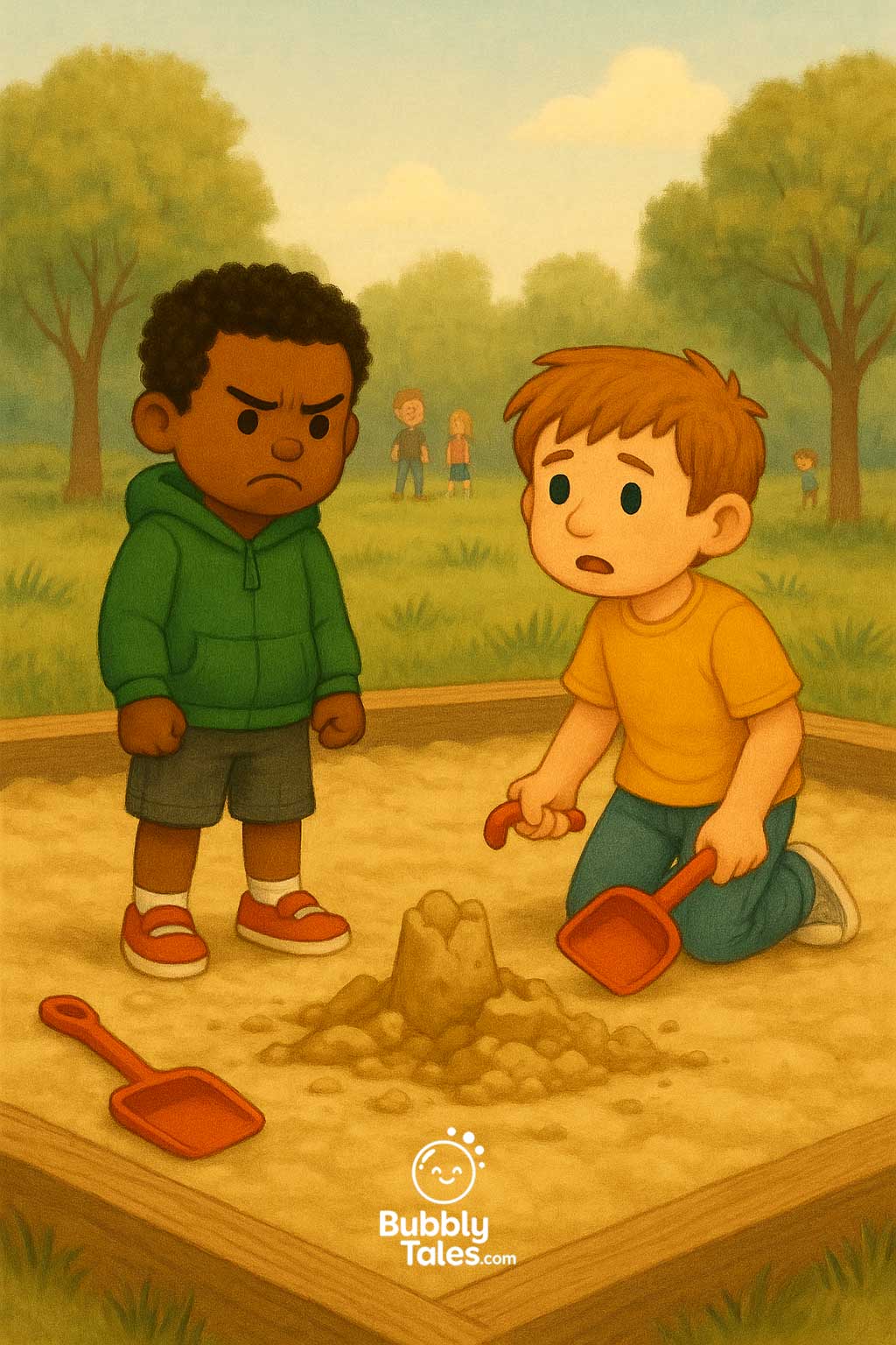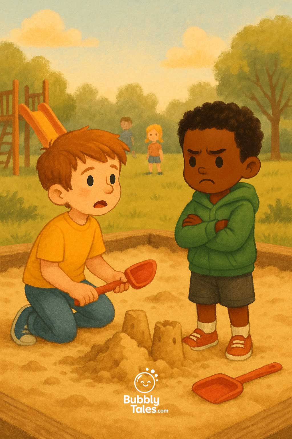Liam and Milo were best friends who loved building the tallest sandcastles. But when Liam grabbed Milo’s shovel without asking, the tower tumbled—splat!